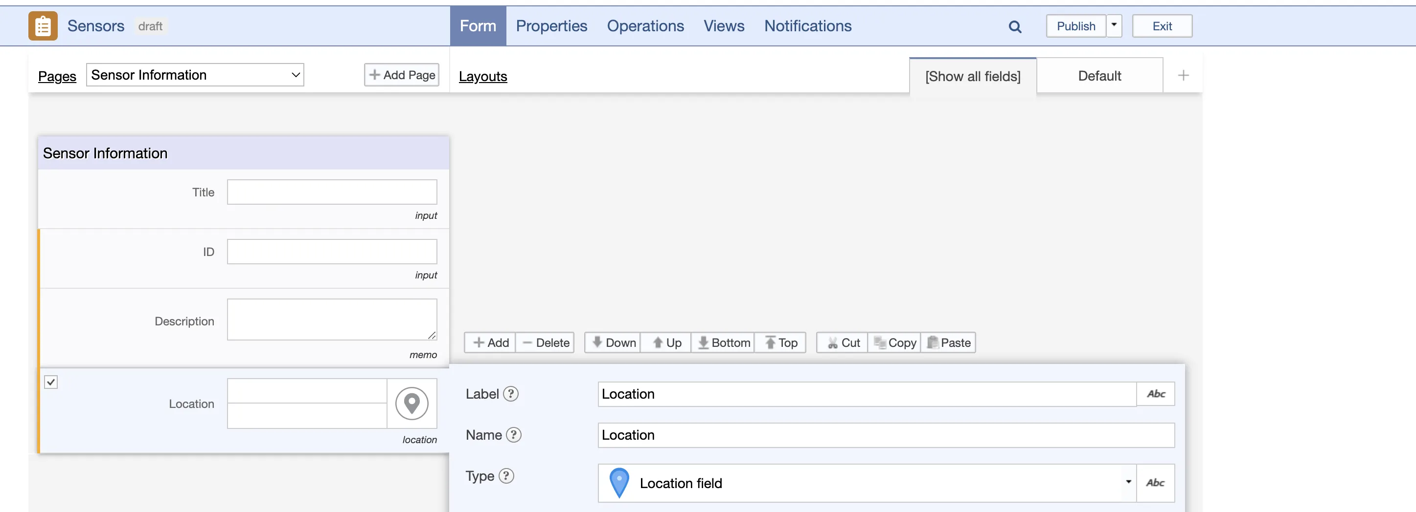- Our first app is to manage the Stream so it's easy to identify once online. Create a New Application, name it (we call ours - 'Sensors') and fill out the 'Properties' section. Then navigate to the 'Form' tab to add 'sensor' meta data fields such as its title/description, unique ID GPS location and any other data that is unique to the sensor.