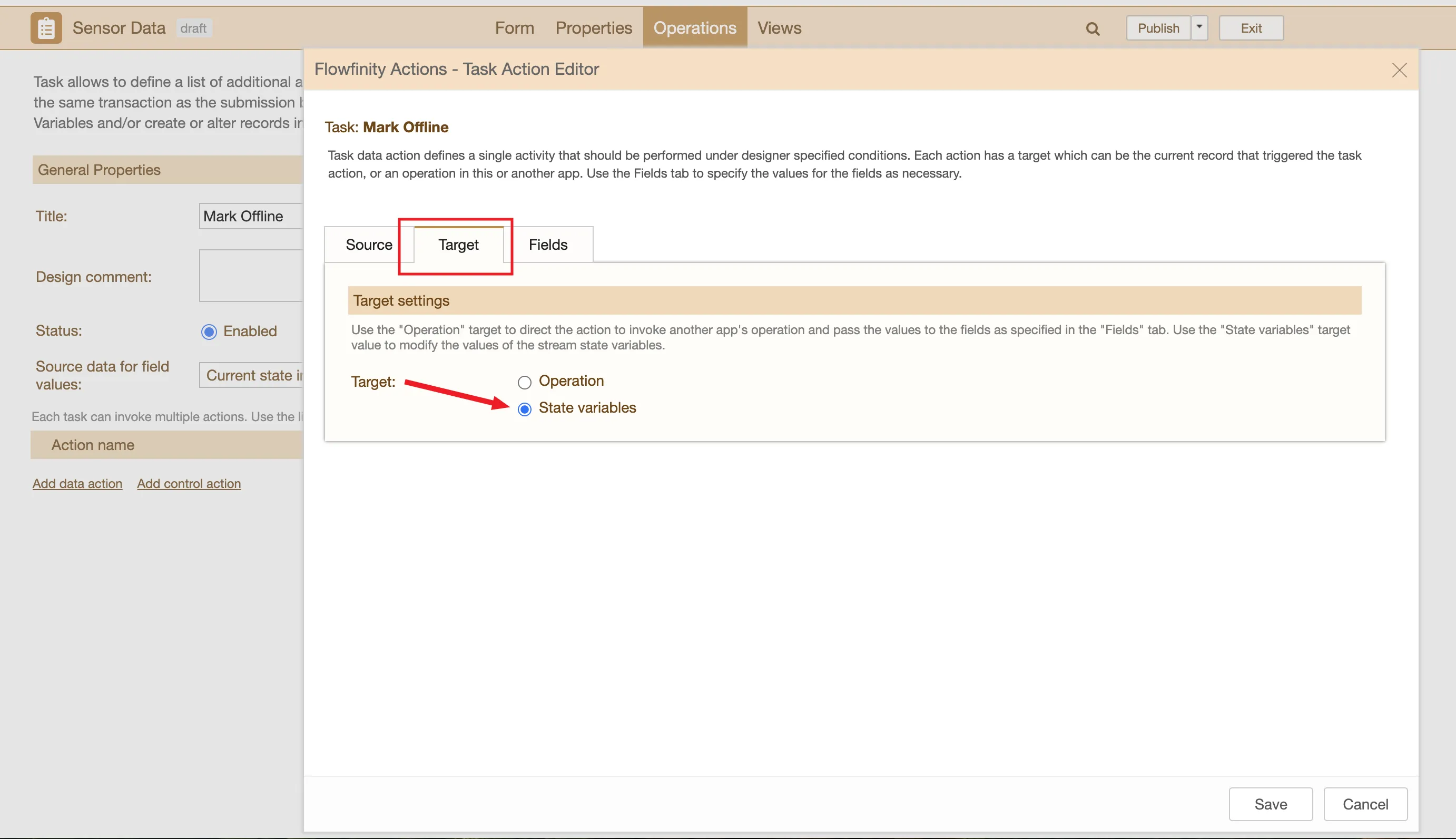 - Switch to the 'Target' tab and change the 'Target' selection to 'State Variable'.