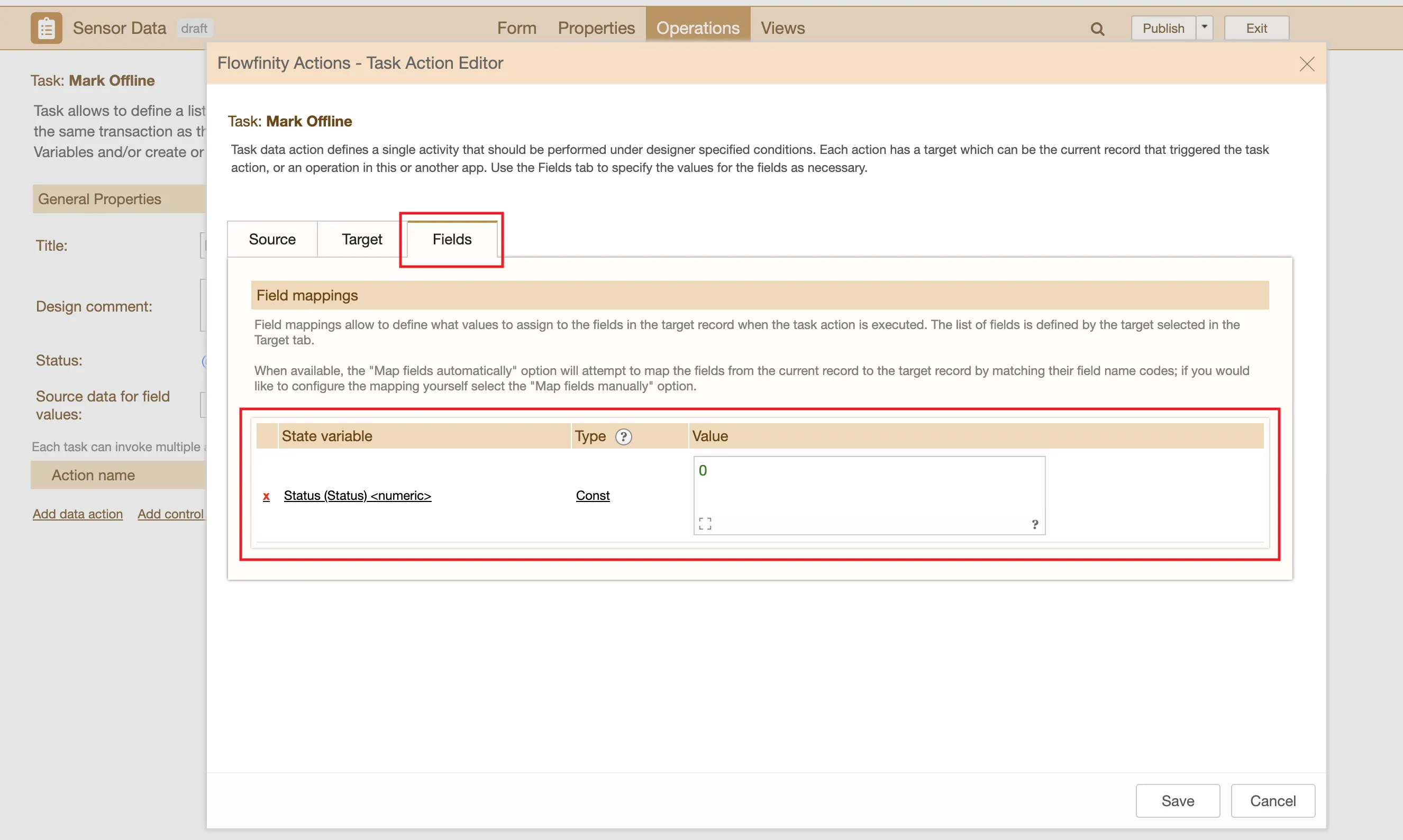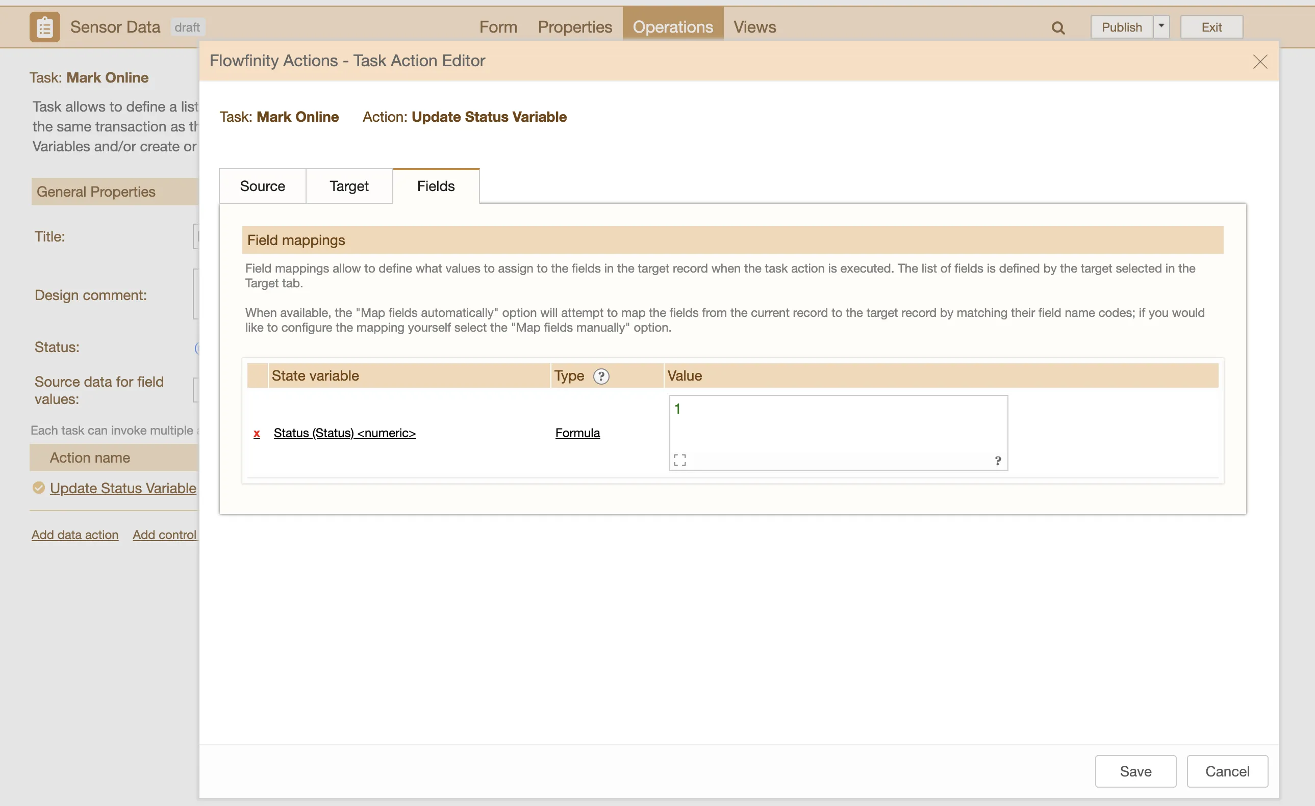 - Switch to the 'Fields' tab to map your field to a state variable. Click 'Add mapping'. Set the 'State Variable' to 'Status