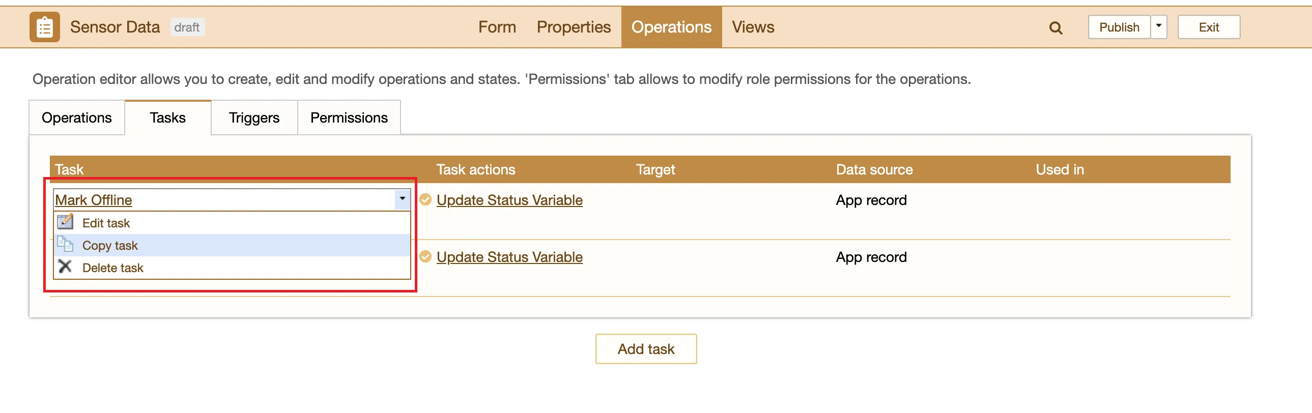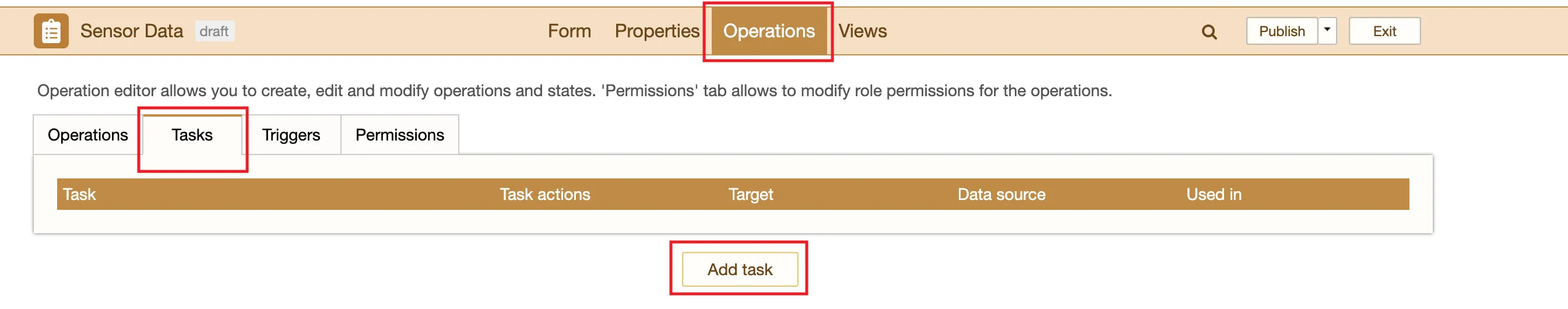 - To track the stream status, we will need to add a task and trigger to the app. First, go to the 'Operations' section and into the 'Tasks' tab.