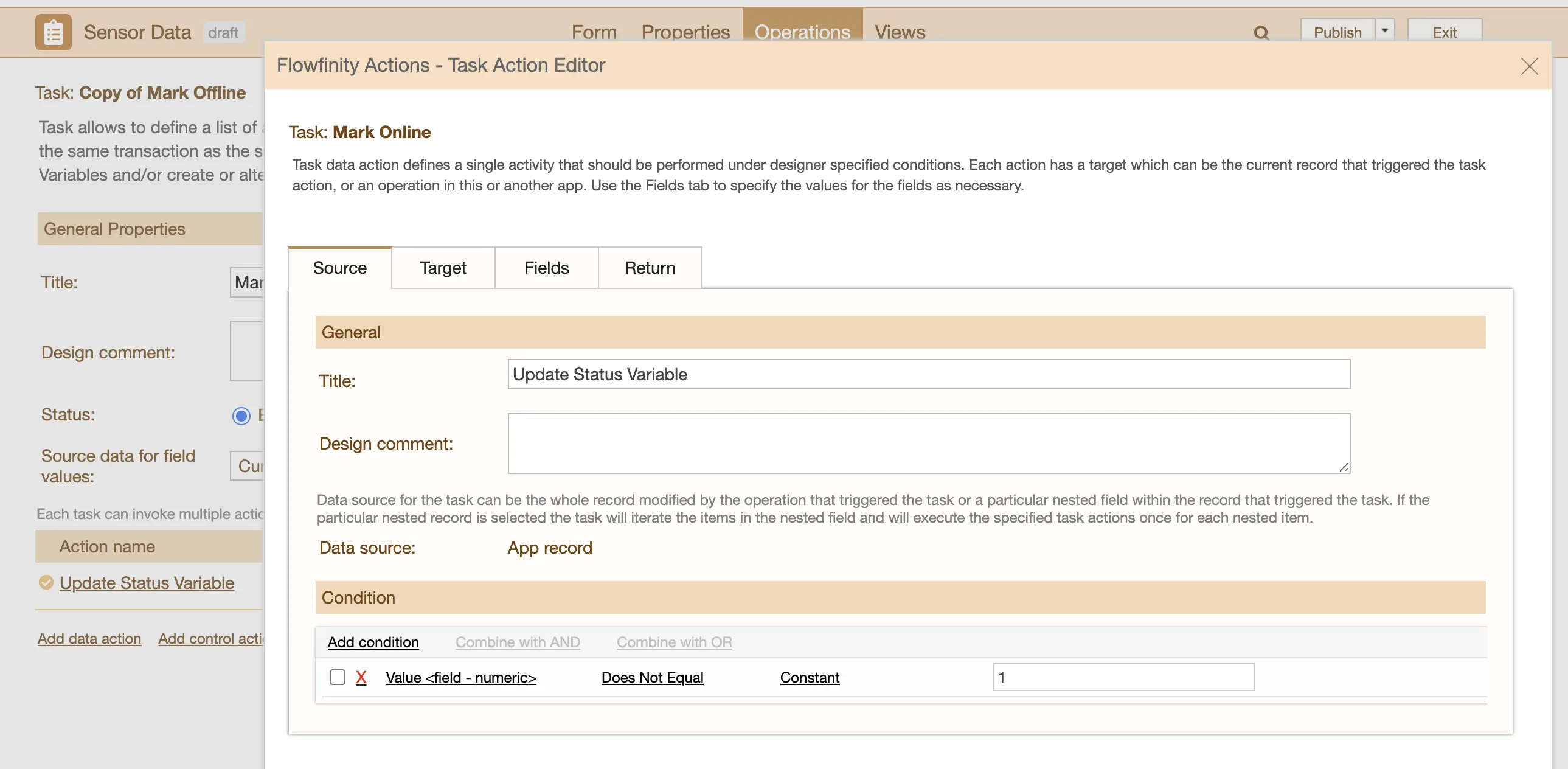 - Save the task and then set up another task, that will esentially invesrese of the first task – resetting the stream to display as 'Online' when a submission comes through and changes the numeric status back to 1.