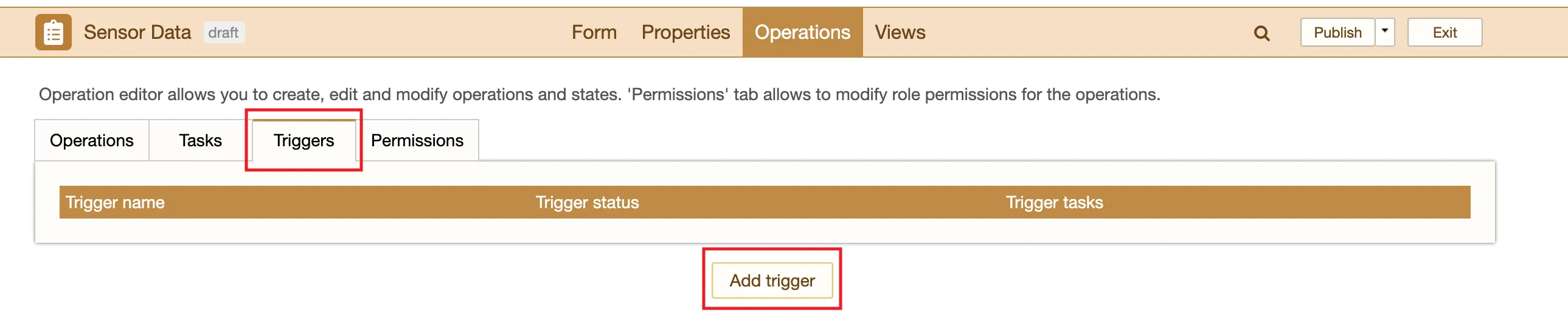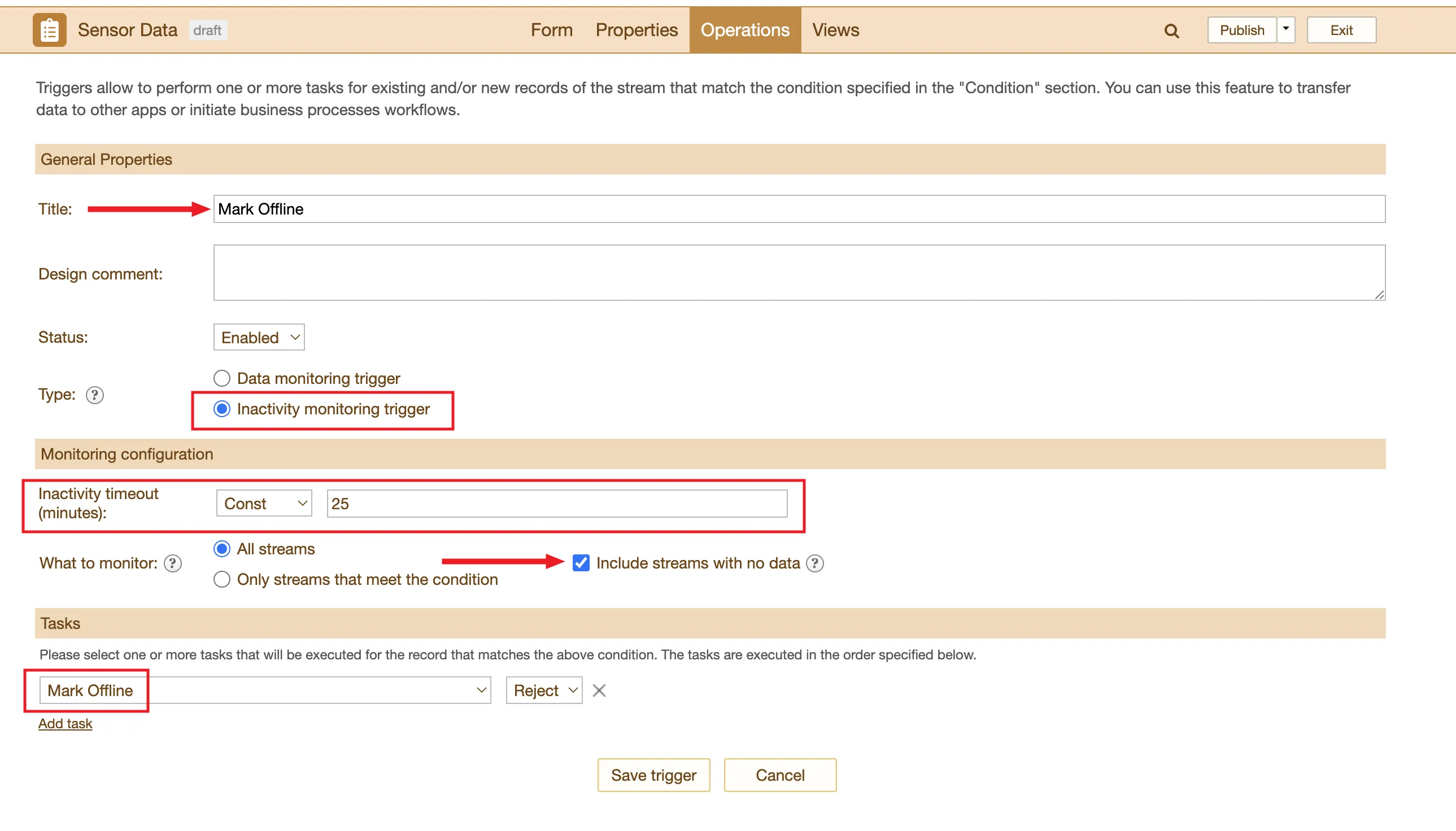 - Add another trigger that will be executed when a submission comes though to change the status back to online. For this trigger add a condition that the status equals to 0 (offline) so that this trigger is only executed at first submission after device went offline. Save trigger.