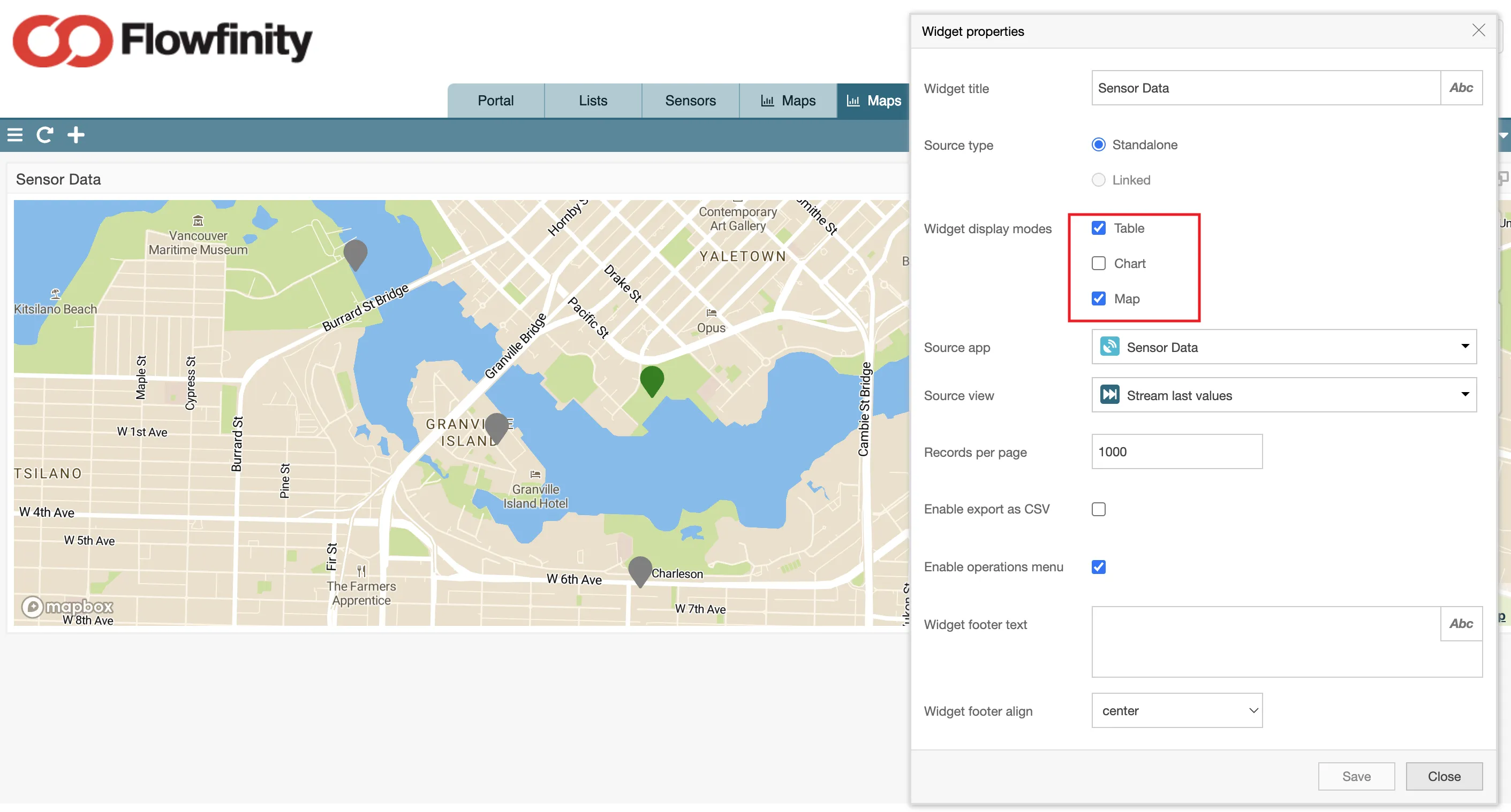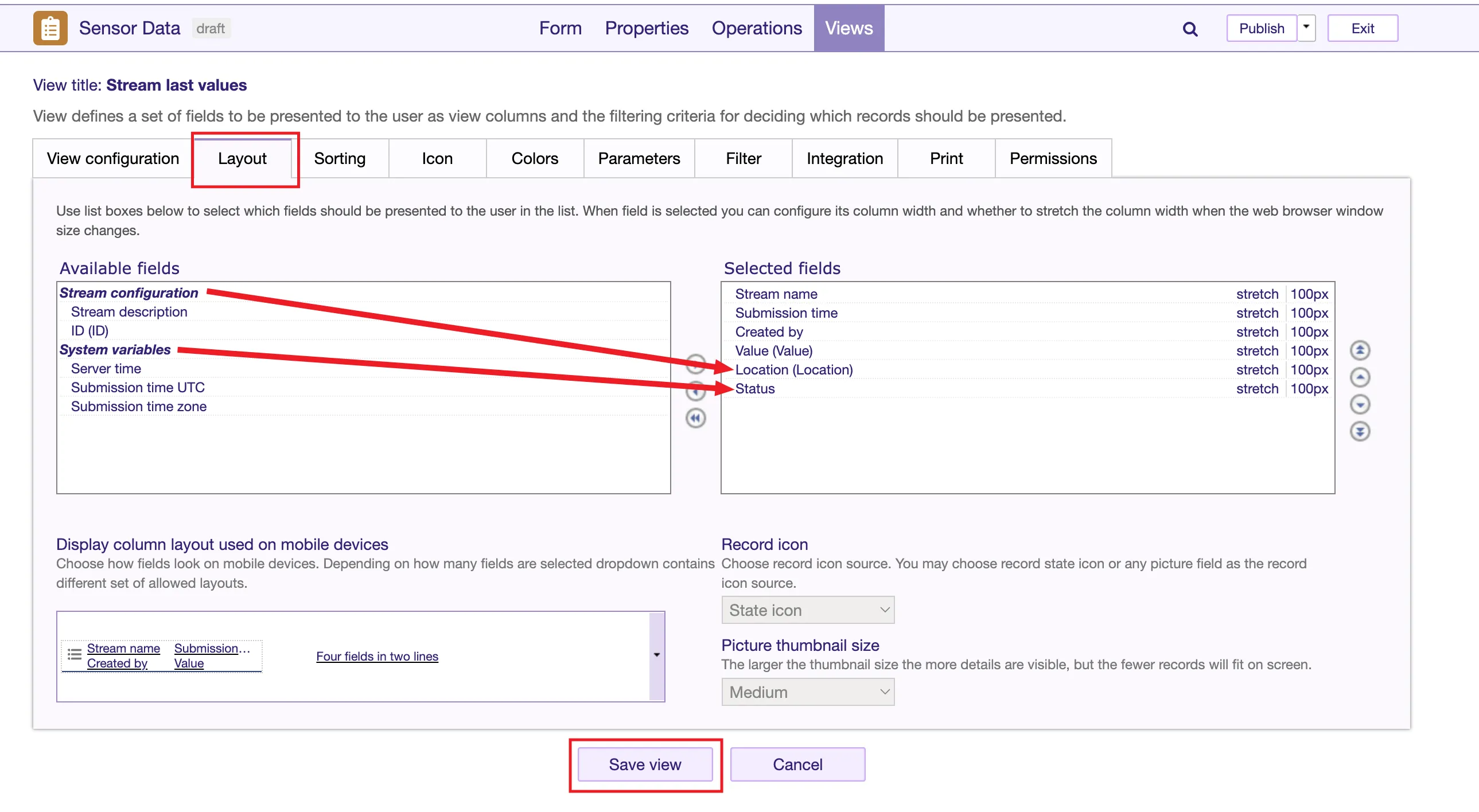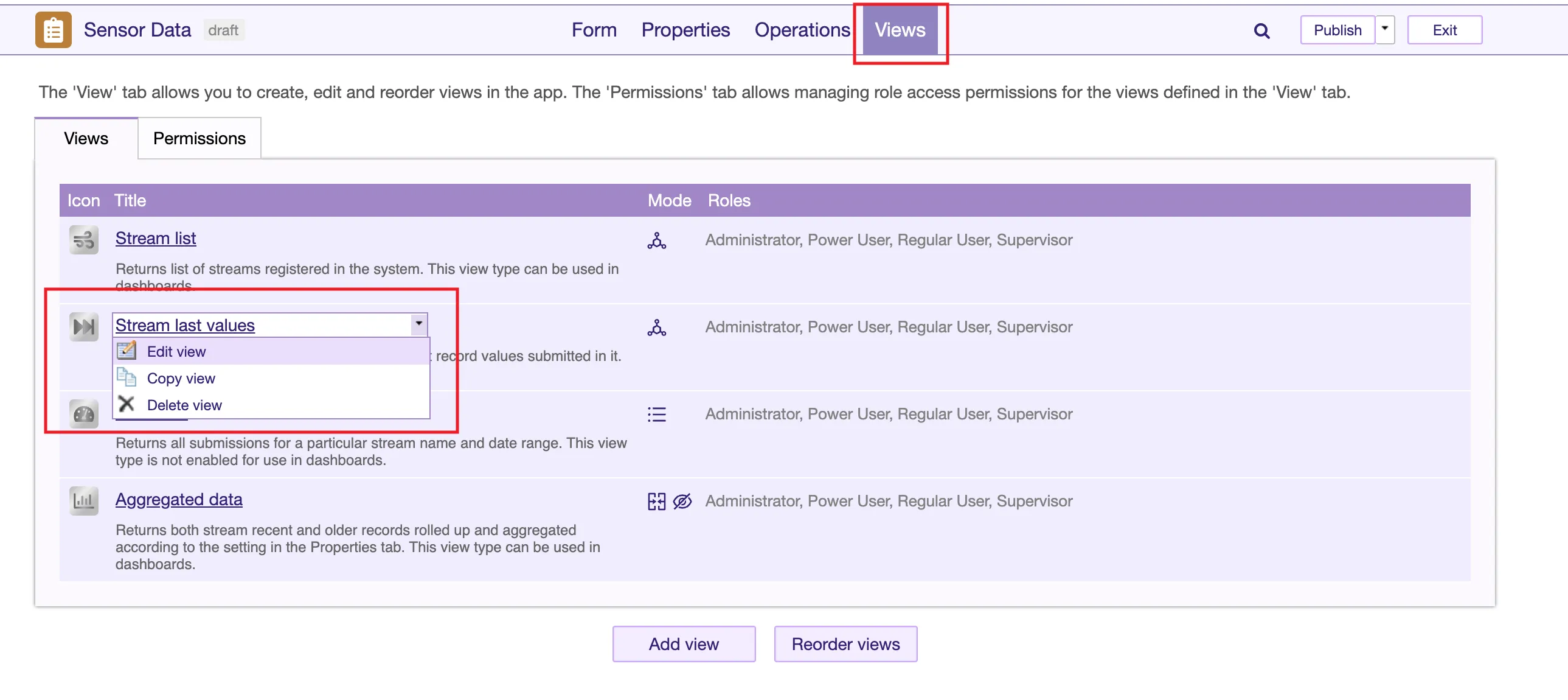 - Lastly switch to the 'Views' section and edit the existing 'Streams last values' view. We will reference this view later as we set up the map in the dashboard.