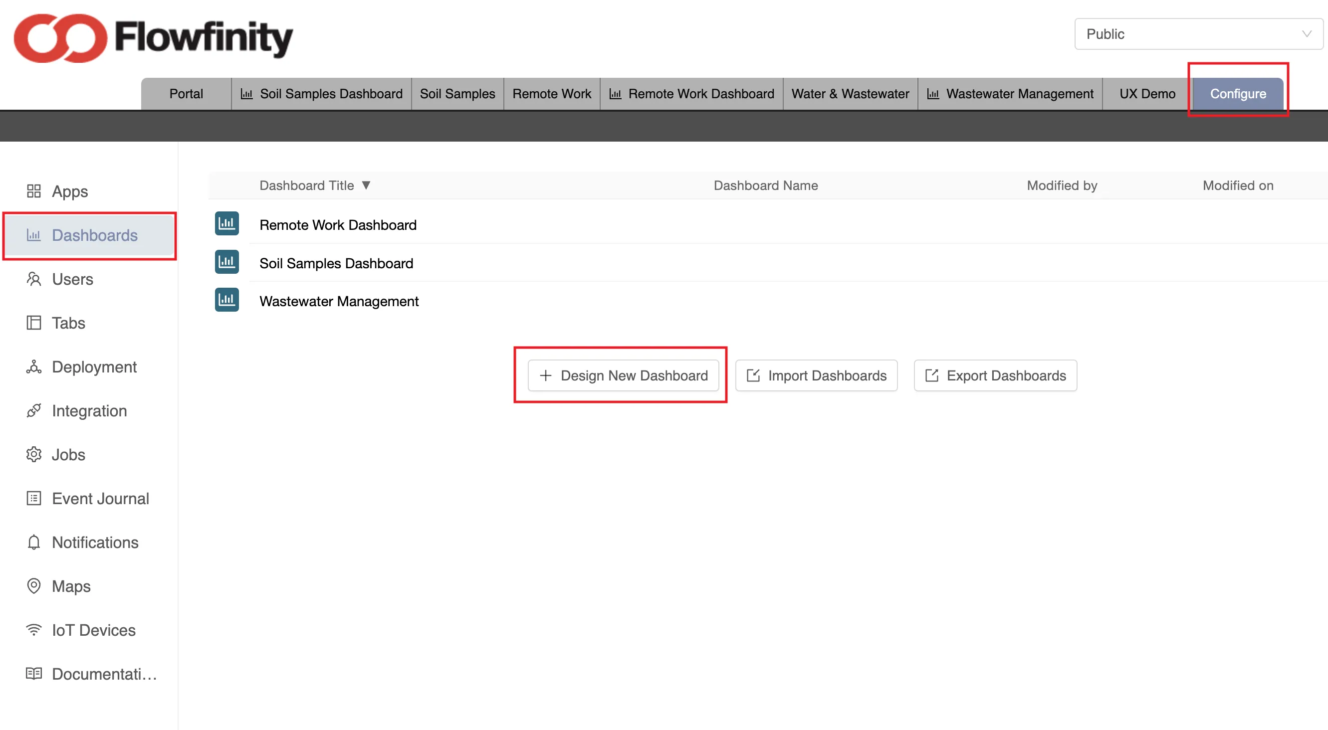 Now we will create (or edit) the dashboard to show the app status on oue map. - Next go to the 'Configure' tab and navigate to the 'Dashboards' section. Click on the 'Design New Dashboard' button to create a new dashboard (or customize the existing dashboard you want to have the map in).