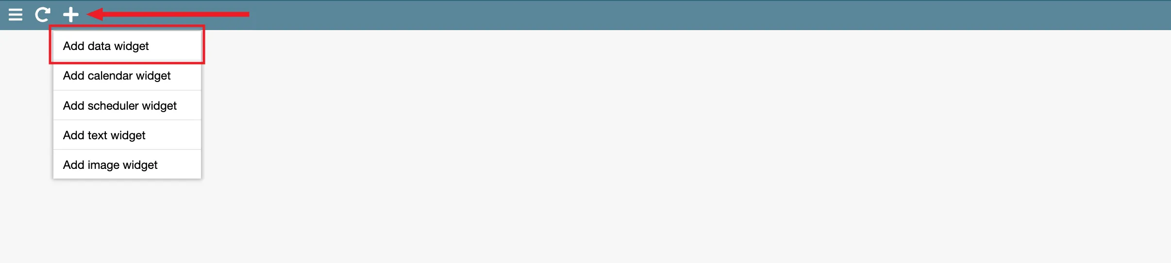 - In the dashboard click on the '+' symbol on top left, and then select the 'Add data widget' option.