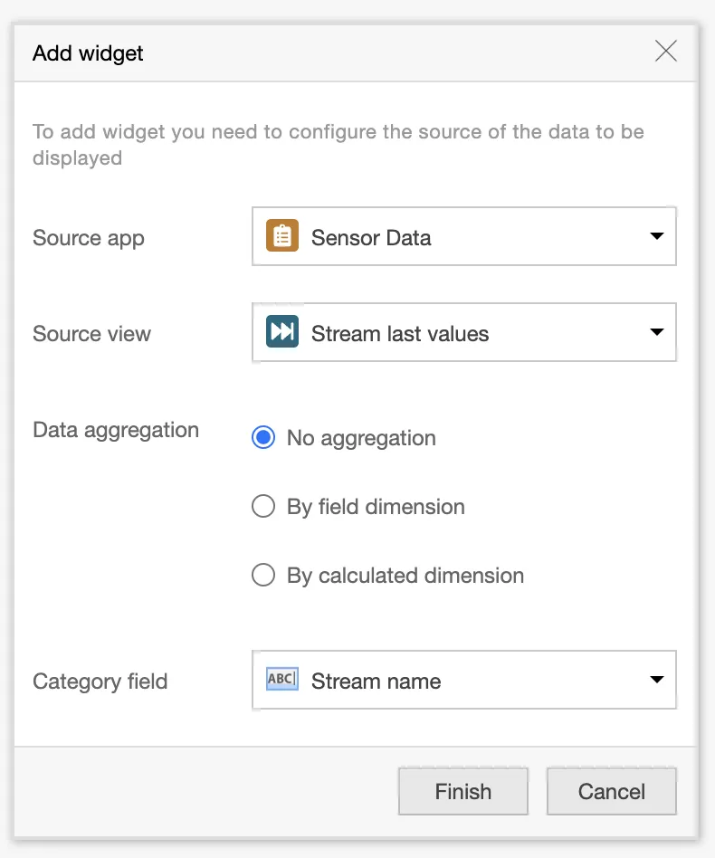 - In the 'add widget' popup select the 'Sensor Data' app, then in the source view select the 'Stream last values' view. Set 'Data aggregation' to 'No aggregation' (we will be displaying unique last value for each stream, so there is nothing to aggregate) and then select the field you want to use as a category for this widget (Stream name). Click 'Finish'.