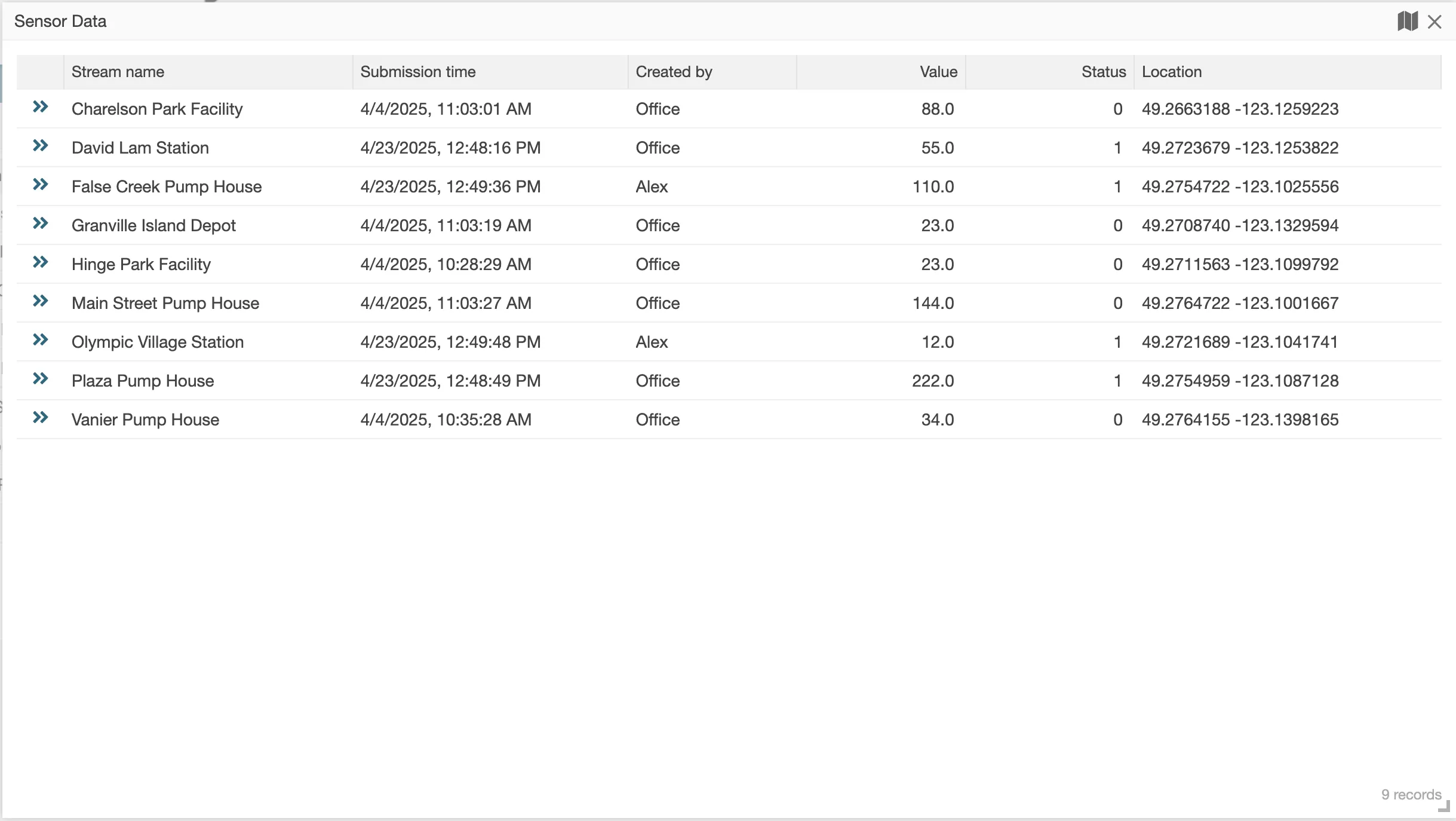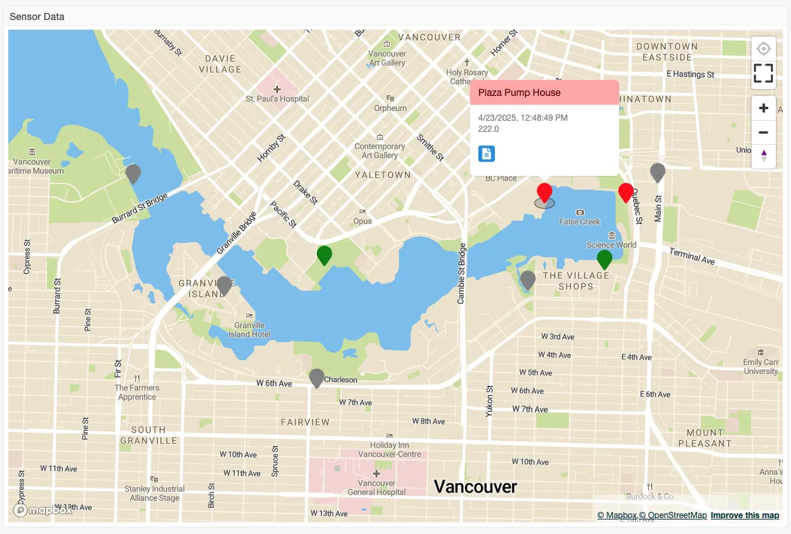You can connect your Flowfinity Streams data to maps hosted in dashboards to display dynamic color coding of map icons to show various parameters or track the status of a stream, for example online or offline. This is a useful way to check the operational status of facilities and environmental sensors remotely at a glance within your geographic areas.