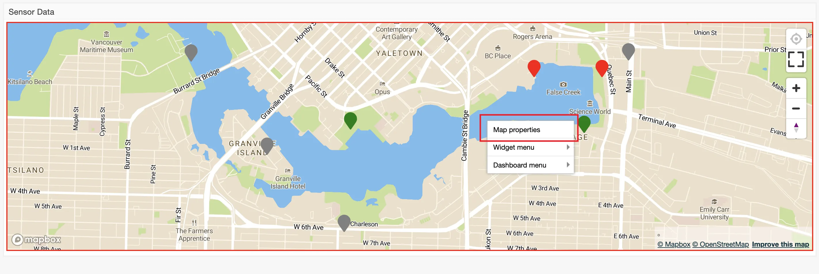 - To change the colors of the pins based on the status of the sensor you need to right click on the map to open options dropdown and then select 'Map Properties'.