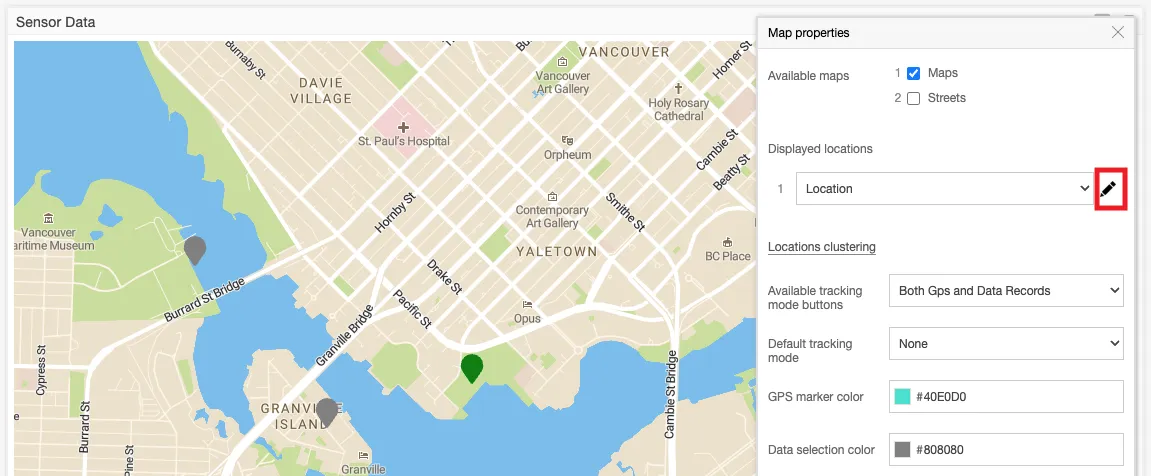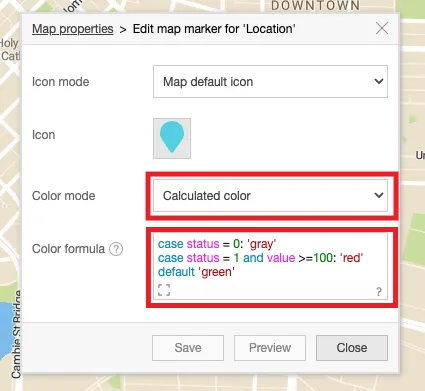 - In the location marker popup you can control the icon style and color on the map, both can be changed based on the data from the stream using formulas.