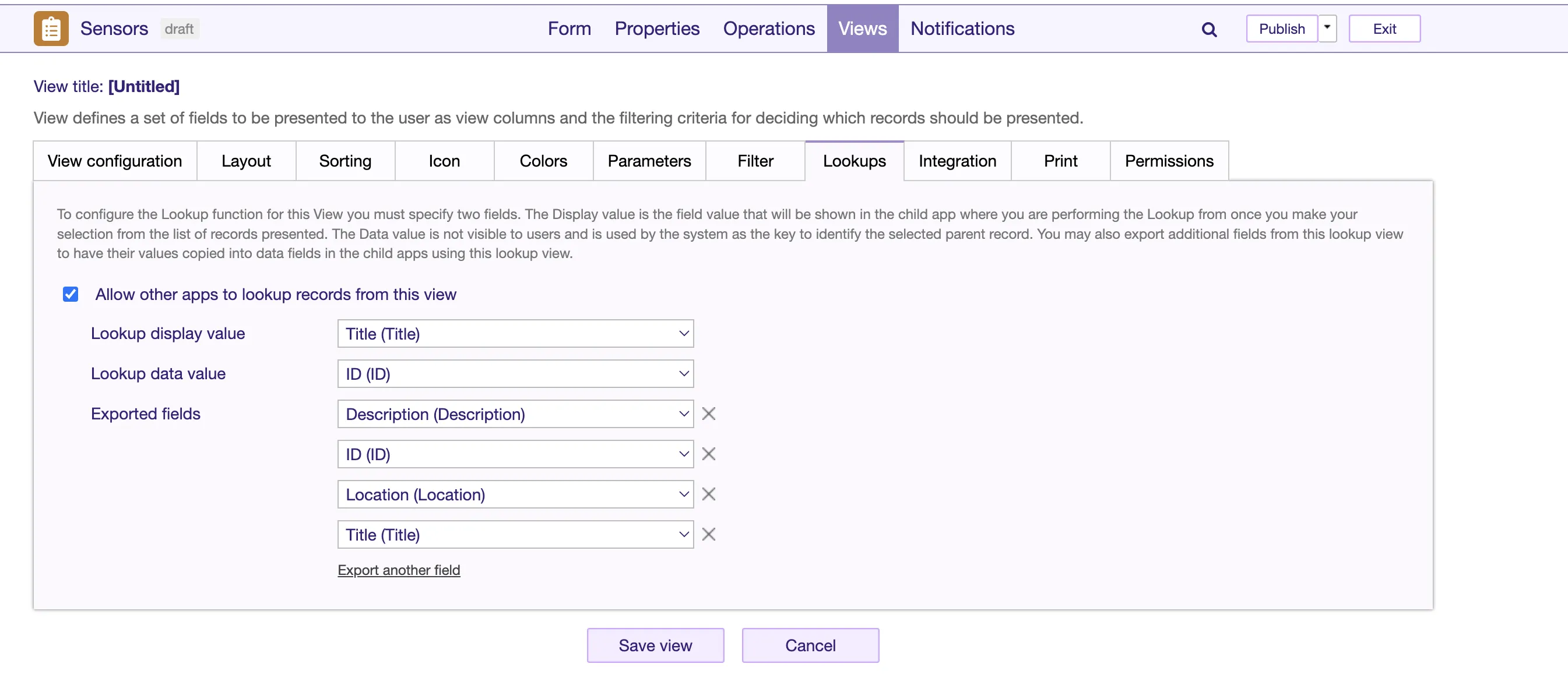 - Switch to the 'Lookups' section, enable the checkbox 'Allow other apps to lookup records from this view' so the view can be used as a lookup and assign your desired export fields.