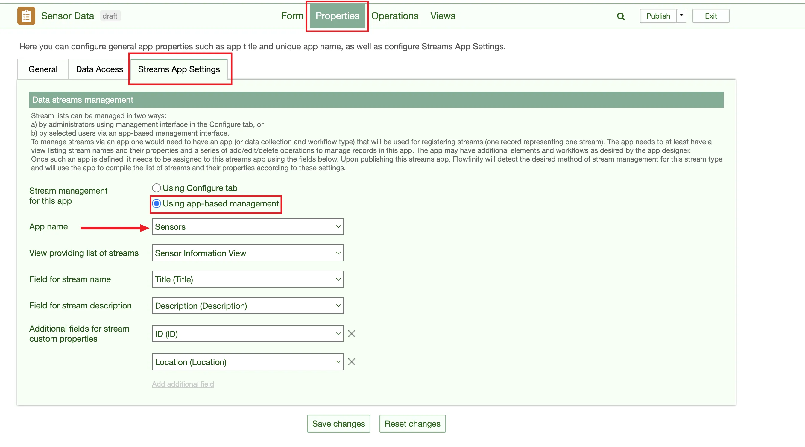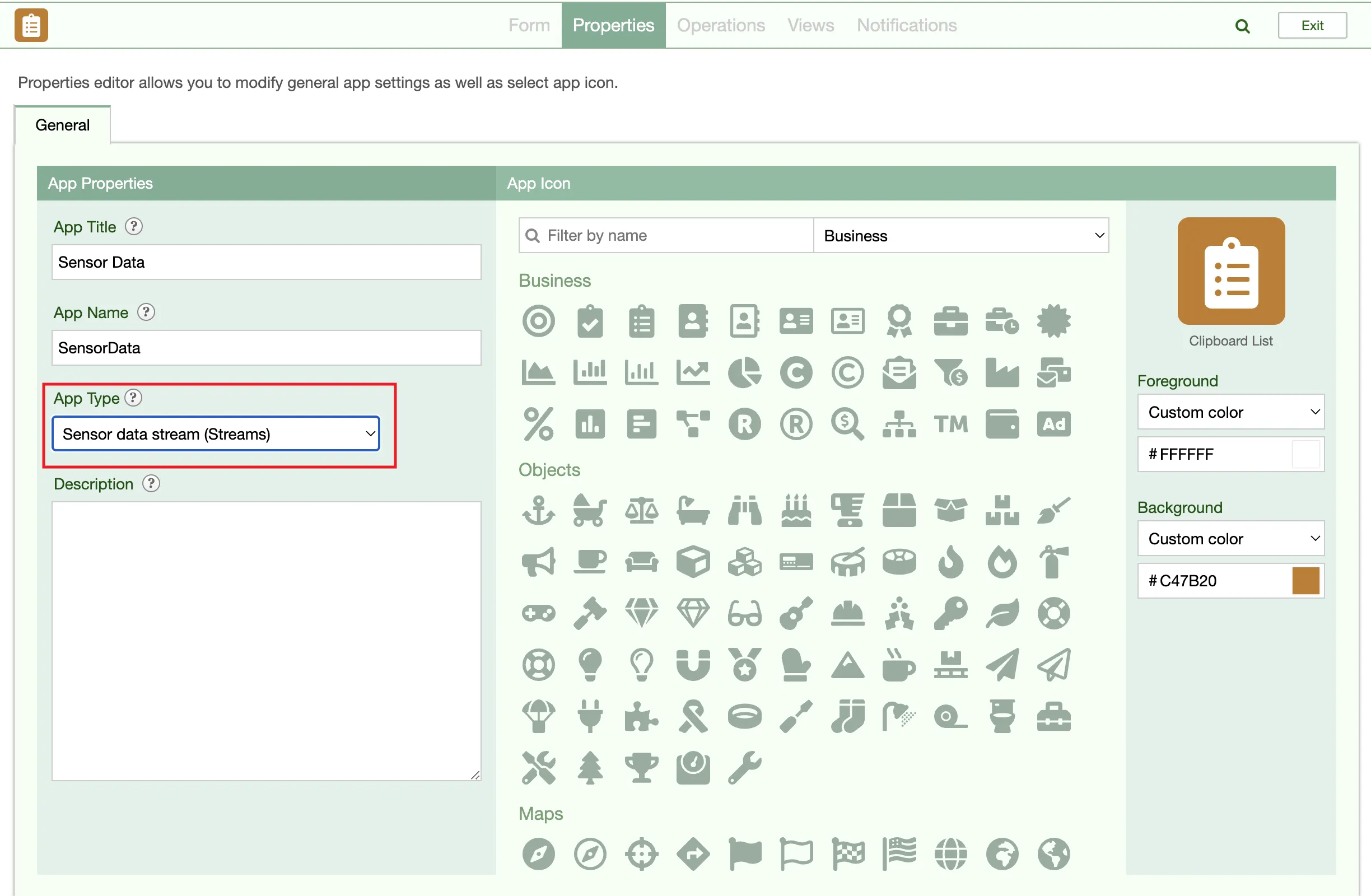 *Note: We will use records in the 'Sensors' app we just created as the definition for data streams from the 'Sensor Data' app. - Click 'Next' to create the app and then navigate to the 'Properties' tab again. Click on the 'Streams App Settings' section.