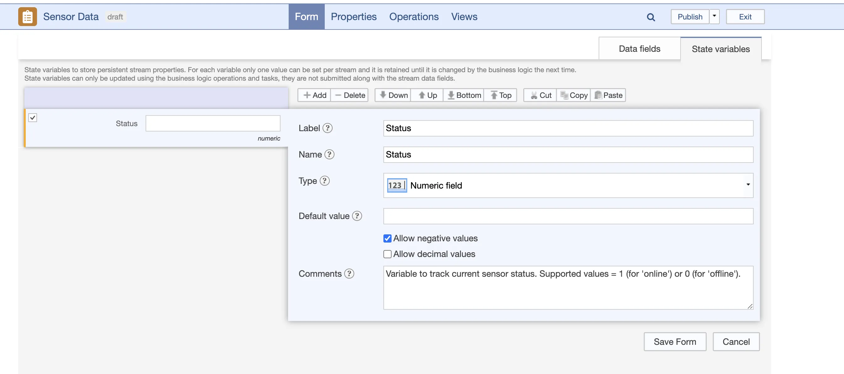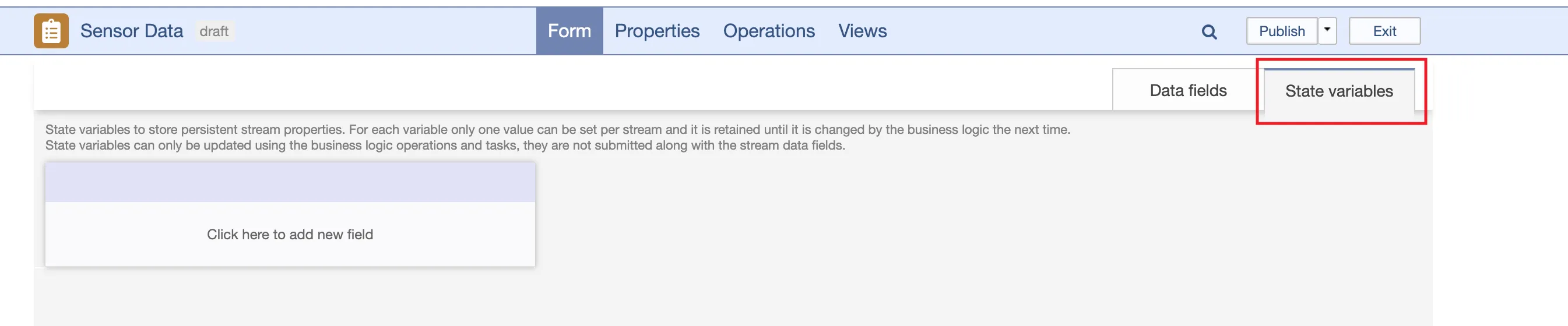 - Return to the 'Form' section and then navigagte to the 'State Variables' section to add the fields necessary for tracking the status of the stream.