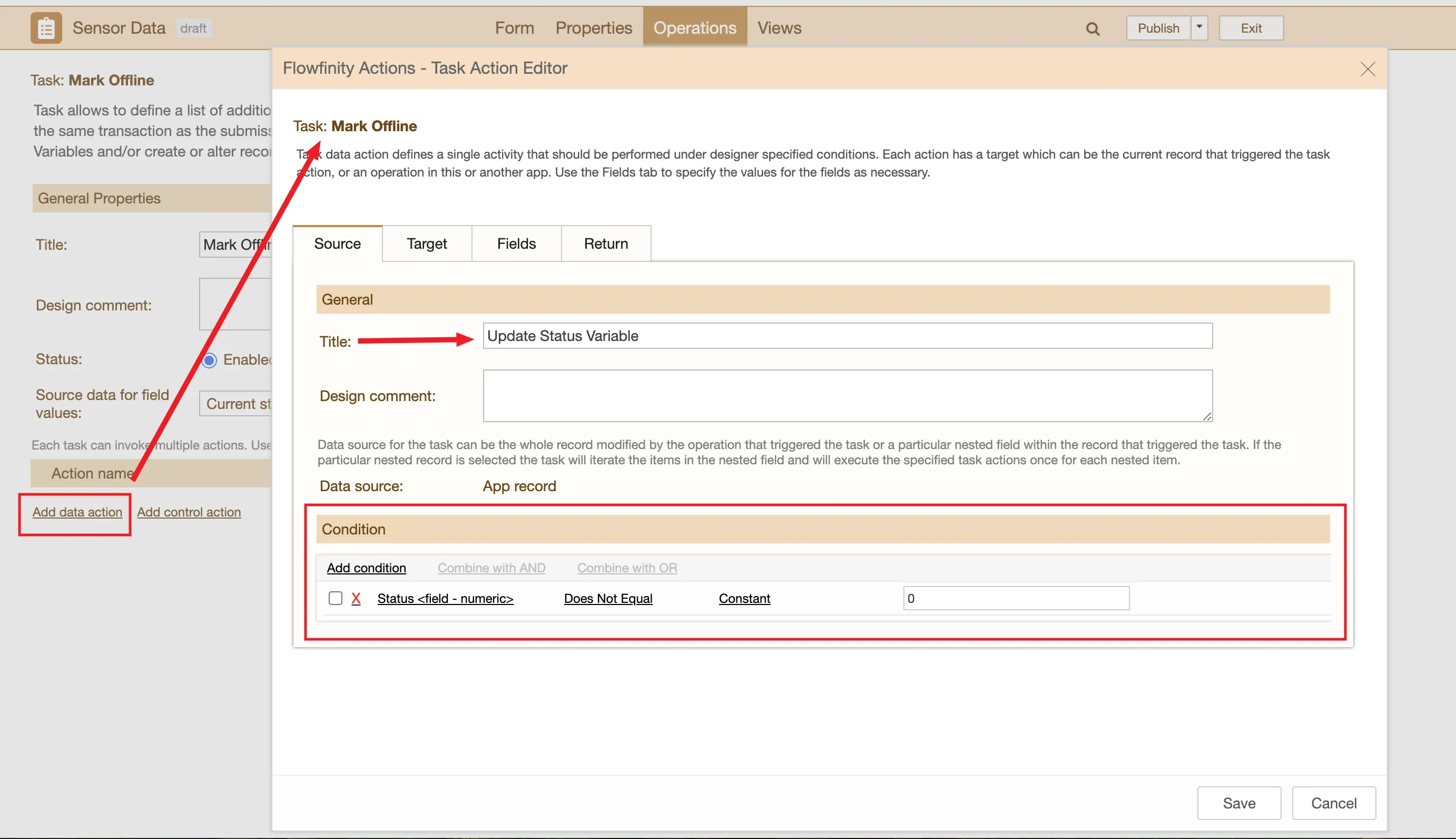 - Within the task configuration pop up, give the task a title (Mark Offline) and then click on the 'Add data action' link to add a new action.