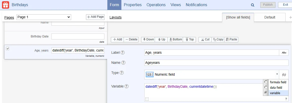 - Create a Numeric field 'Age, years' and set the type as 'variable'. Enter the formula: datediff('year', BirthdayDate, currentdatetime())