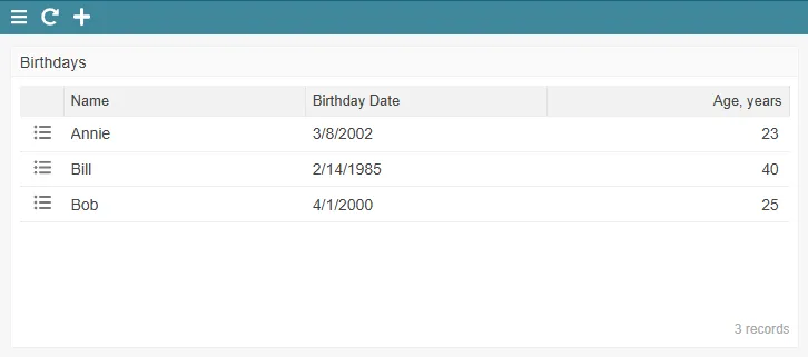 Create a Text field 'Name' and a Date field 'Birthday Date'.
