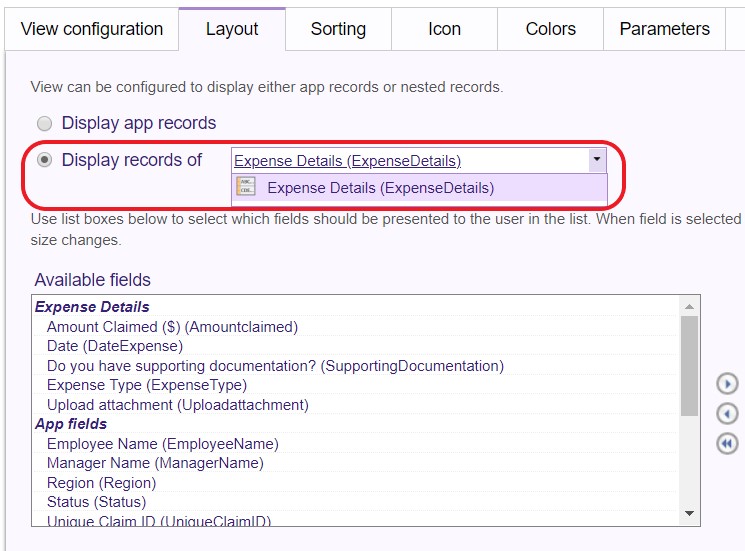 - Click the Layout tab, select 'Display records of' and choose which set of records to display. In this instance, select the nested field records in 'Expense Details.'