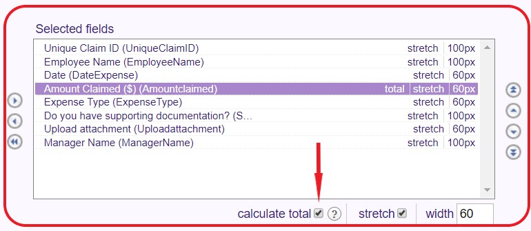 - Specify which fields to move from 'Available fields' to 'Selected fields' and format the display order. To calculate the total of a column numeric fields then select that field and click 'calculate total'. For example, the total of all outstanding expense claims.